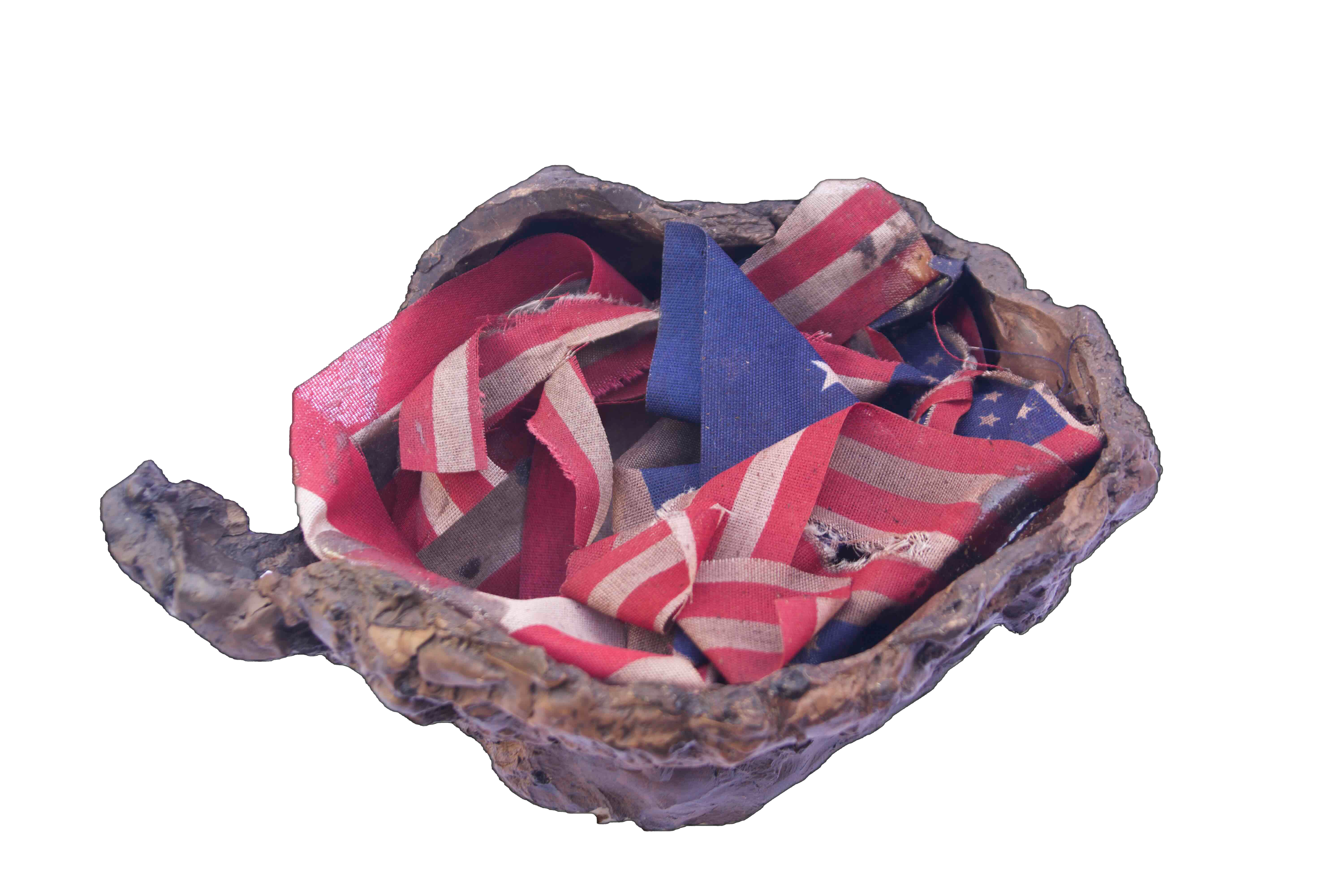 Clay, soil, herbs, flowers, bones, flag, pill bottles, photographs.